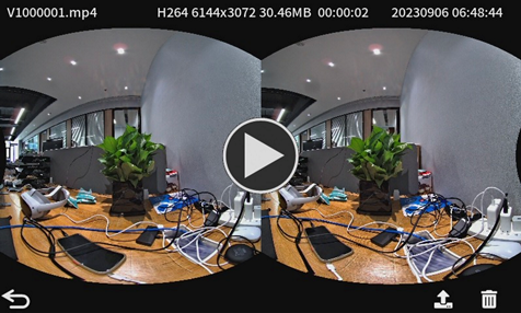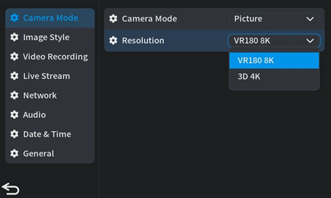 - Recording: Power on -> Tap the "Settings" icon in the bottom right of the screen or press the "Menu/OK" button -> Enter the menu -> Tap "Camera Mode" -> In the right-hand menu, select "Video" from the dropdown menu of "Camera Mode" -> Choose the appropriate video format (VR180/3D) from the drop-down menu -> After completing the basic video recording settings, press the camera's "Back" button -> The video recording icon will be displayed in the top left corner of the screen, indicating that you can start shooting VR180 or 3D video.