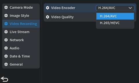 - Basic video parameter settings: Power on -> Tap the "Settings" icon in the bottom right of the screen or press the "Menu/OK" button -> Enter the menu -> Tap ''Record" -> In the right-hand menu, select "video Encoding" and "Video Quality."