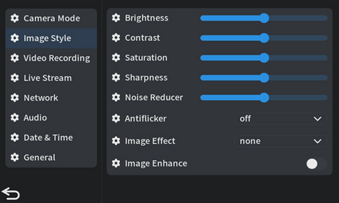 - Image style settings: Power on -> Tap the "Settings" icon in the bottom right of the screen or press the "Menu/OK" button -> Enter the menu -> Tap "Image Style" -> Adjust settings such as "Brightness," "Contrast," ""Saturation," "Sharpness," "Noise Reducer," etc. for video.